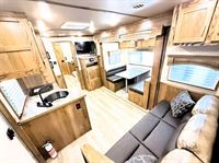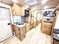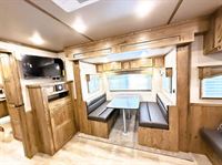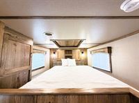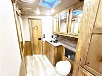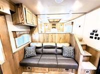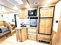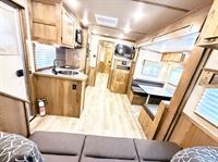 Features:This stunning stock back Lakota has an 11' living quarters with a 6 ' slide out. Living quarters features includes a ducted air conditioning, television, queen-sized bed, closets, dinette-sleeper in the slide, large refrigerator, microwave, and recessed cook top. The private bathroom includes a vanity, sink, rain sensor fan and a large radius shower. There is a pass-through door into the pie shaped mid-tack with an access ramp, 4 tier saddle rack, and bridle racks. The stock area is 15'7" with a floating center gate and tracked plexi glass. Additional features include duel hydraulic jacks, awning, interior and exterior speakers. This trailer is 34' long and 8' wide