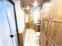 Features:This stunning 5 horse reverse load Elite trailer has an elegant 14' Outback Customs interior that features a queen-sized bed, closets, a sofa-sleeper on the riser wall with a half dinette and a drop down bunk; the kitchen area features a large refrigerator, sink, recessed stove and a microwave. The private bathroom has a radius shower, sink with vanity and mirror, double hanging closet with a outside access door, and a walk-through door into the horse area. The horse compartment features a stud stall in the front slant along with a telescoping divider, air flow slant gates, side load ramp, mangers with under manger storage, and a roadside escape door. The full rear tack features two 3-tier saddle racks, blanket bars, boot boxes, a boot rack, storage shelves and lots of bridle hooks. Additional features include a diesel generator, hay pod with ladder, an electric awning, and a hydraulic jack. This trailer has a floor length of 36'.