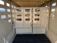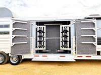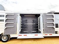 Features:This Elite 26' show cattle includes the highly desirable double door side tack features two 3-tier saddle racks, blanket bars, and bridle hooks. The stock area has an angled slant gate, a 50" roadside escape door and a full rear door with a slider. The roadside carpeted dressing room features a brush box/bench, bridle hooks, clothes rod, and a storage shelf for the plexiglass inserts. Additional features a tie rail on both the inside and the outside of the trailer, a hay rack with ladder and a hydraulic jack.