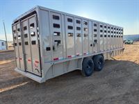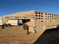 Features:This bright ruby red 20' Eagle X stock combo features a 6' tack room with access doors on both sides along with 2 - 3 tier saddle racks, bridle hooks, brush boxes and calf gates in the nose. The stock area features 48" escape doors on both the curb and roadside of the trailer, a center gate, hoof grip flooring, butterfly rear doors and cow coozies to seal up the stock area. Additional features include a single electric jack, brush fenders, quick release coupler, LED working lights on the interior and exterior of the trailer and its powder coated. This trailer is 7' tall and 7' wide.