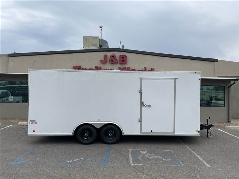 Description: | J&B Trailer World J&B Trailer World -Cargo Mate 102x20-7K GVWR, 7' tall -7000# GVWR -3.5K 4" drop axles w/4 wheel brake -ST205-75-RADIAL Tires -030 aluminum skin -TRAILER IS 90% SCREWLESS. SCREWS AT SEAMS ONLY -3/4" plywood floor and 3/8" plywood walls -6" Ibeam main frame -2"x6" structural tube tongue -One piece Aluminum roof -12V interior lights w/wall switch -Roof vent -24" stone guard -48" Sidedoor w/flush lock and cam bar lock -7' tall -Built in beaver tail -Ramp door -2-5/16" coupler -2K top wind jack -Rear header trimmed in aluminum diamond plate -Diamond plate fender flares We stock this trailer in different colors. Call for current colors available. Delivery and financing available!! |