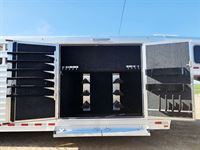 Description: This 5 horse Elite stock combo with the two-door side tack has two 3-tier saddle racks, blanket bars, boot hooks, and brush boxes.  The roadside dressing area features an air conditioner, more bridle hooks, a boot box and a shelf. This trailer has air flow dividers, a roadside escape door, a hay rack with ladder and a hydraulic jack. This trailer has a floor length of 27'.