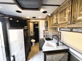 Features:This stunning 5 horse reverse load Elite trailer has an elegant 14' Outback Customs interior that features a queen-sized bed, closets, a sofa-sleeper on the riser wall with a half dinette and a drop down bunk; the kitchen area features a large refrigerator, sink, recessed stove and a microwave. The private bathroom has a radius shower, sink with vanity and mirror, double hanging closet with a outside access door, and a walk-through door into the horse area. The horse compartment features a stud stall in the front slant along with a telescoping divider, air flow slant gates, side load ramp, mangers with under manger storage, and a roadside escape door. The full rear tack features two 3-tier saddle racks, blanket bars, boot boxes, a boot rack, storage shelves and lots of bridle hooks. Additional features include a diesel generator, hay pod with ladder, an electric awning, and a hydraulic jack. This trailer has a floor length of 36'.