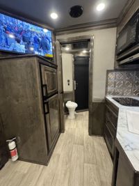 Features:This stunning matte gray Lakota Charger Livestock Edition has an 18' stock compartment with a floating center gate, roadside escape door and a corner storage closet. The 13' living quarters features a queen-sized bed and closet in the bedroom area, a sofa-sleeper on the riser wall, a dinette-sleeper in the 6' slide out. There is an additional hanging closet/entertainment center with a television; along with a full kitchen that includes a large sink, recessed cook top, microwave and large refrigerator. The bathroom contains three medicine cabinets with mirrors and vanity lighting for lots of storage, a double door hanging closet, a large shower, 2 cowboy hat racks, a large mirror and a walk-through door into the horse area. The double door side tack features 2 4-tier swing out saddle racks, blanket bars, brush boxes and lots of bridle hooks. Additional features include an awning, dual hydraulic jacks, and a hay pod with a ladder. This trailer has a floor length of 38'.