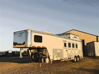Features:This 2006 Elite 4 horse living quarters is an absolute gem. The living quarters features a queen-sized bed, a full kitchen with a sink, recessed cooked top, microwave and full-sized refrigerator. The private bathroom features a large radius shower, sink with vanity, closet and a walk-through door into the mid tack/mud room. The mid tack/mud room has two large storage shelves, bridle hooks, and a walk-through door into the horse area. The horse compartment features a stud stall in the front slant, mangers with under manger storage, and hoof grip flooring. The collapsable rear tack has a 4-tier saddle rack, blanket bars, bridle hooks and a brush box. Additional features include a rear loading ramp, dual hydraulic jacks and a hay pod with ladder. This trailer has a 33' floor length.