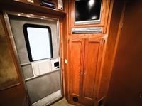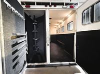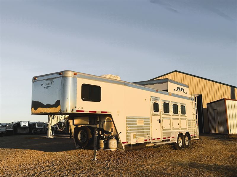 Features:This 4 horse Integrity living quarters trailer features a small refrigerator, kitchen sink, bench with storage along the riser wall, an entertainment with storage and 2 hanging closets in the bedroom area. The fully private bathroom features a shower, toilet, storage area, and a walk-through door into the horse area. The collapsable rear tack room has a 4-tier saddle rack, blanket bars, brush box and bridle hooks. Additional features include a haypod with ladder, mangers with under manger storage, and an electric jack.