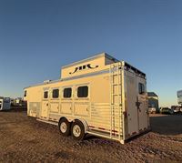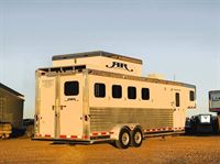 Features:This charming 4 horse Circle J Mirage living quarters trailer has 5' living quarters that includes a kitchen sink, shower, individual sized sofa, queen sized bed, air conditioning, lots of storage and a walk-through door into the horse area. The horse area includes a manager with under manager storage, and a stud stall in the front slant. The collapsable rear tack includes a 4-tier saddle rack and bridle hooks. This trailer has a floor length of 22' long.