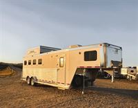 Features:This 4H Elite with a 12'8" Outback Customs living quarters reverse load has all the options. The interior features a queen-sized bed, television and closet in the bedroom. The living area has a sofa-sleeper on the riser with a dinette sleeper, an entertainment center that includes a second television, hat racks, and DVD/CD/AM/FM player. The kitchen includes a large refrigerator, cook top, microwave and sink. The private bathroom includes a large radius shower, vanity with lights, a dual hanging closet and a walk-through door into the horse area. The horse area features a load ramp, stud stall in the first slant, air flow dividers, a telescoping slant in the last stall, and managers with under manger storage. The full rear tack includes a 4-tier saddle rack, shelves, bridle hooks, brush boxes, boot hooks and a saddle pad rack. Additional features include 3 awnings, ducted air conditioning, indoor and outdoor speakers, a hay pod with a ladder, a roadside escape door, shocker hitch and a hydraulic jack. The floor length is 32' long by 8' wide.
