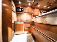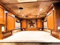 Features:This 4 horse Cimarron has an Outlaw Conversions interior has a sofa-sleeper in the 6' slide out, corner lounge chair; along with a full kitchen that has a large refrigerator, microwave, and large sink. The fully private bathroom has a large radius shower, sink with vanity and double-sided mirror, and a walk-through door into the horse area. The horse area has a stud stall in the front slant, air flow dividers, mangers with under manger storage, and hoof grip flooring. The collapsable rear tack has a 4-tier saddle rack, blanket bars, brush boxes and lots of bridle hooks. Additional features include a hay pod, generator, awning and hydraulic jack. This trailer has a floor length of 32'.